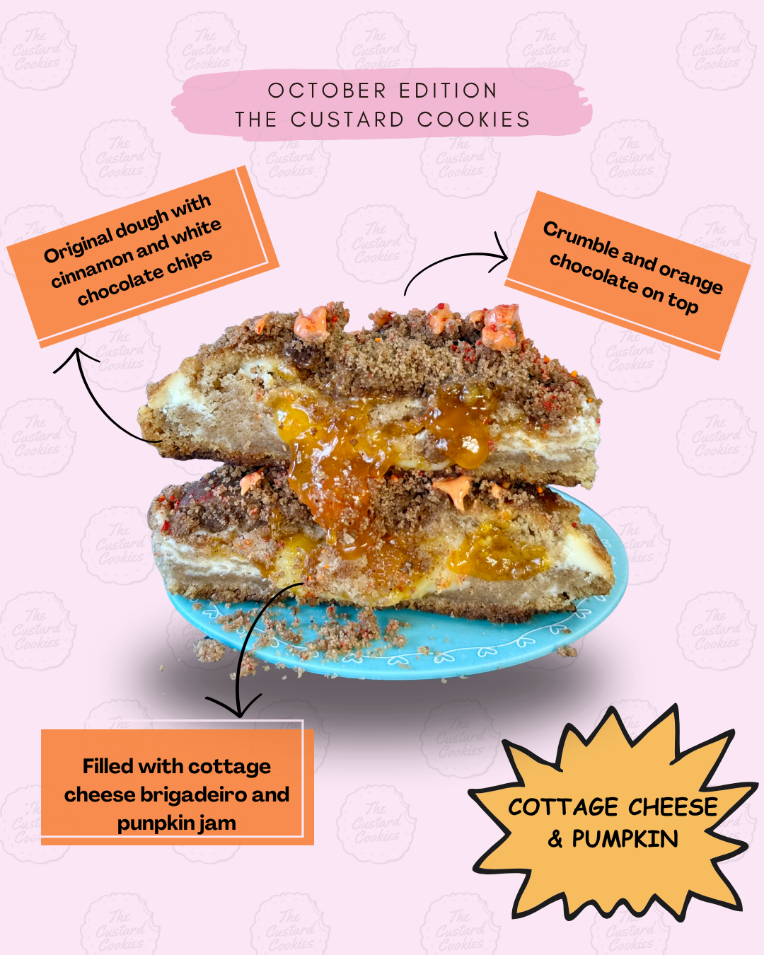 Uma massa amanteigada aromatizada com canela e pepitas de chocolate branco, recheada com um brigadeiro cremoso de requeijão e doce de abóbora caseiro.