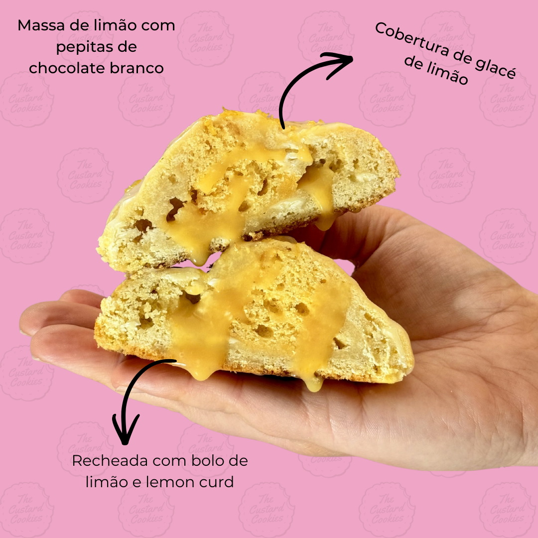 A massa é aromatizada com raspas de limão fresco, criando uma cookie macia e perfumada. No interior, escondemos um recheio generoso de lemon curd cremoso e um cubo de bolo de limão, que adiciona ainda mais textura e intensidade ao sabor.